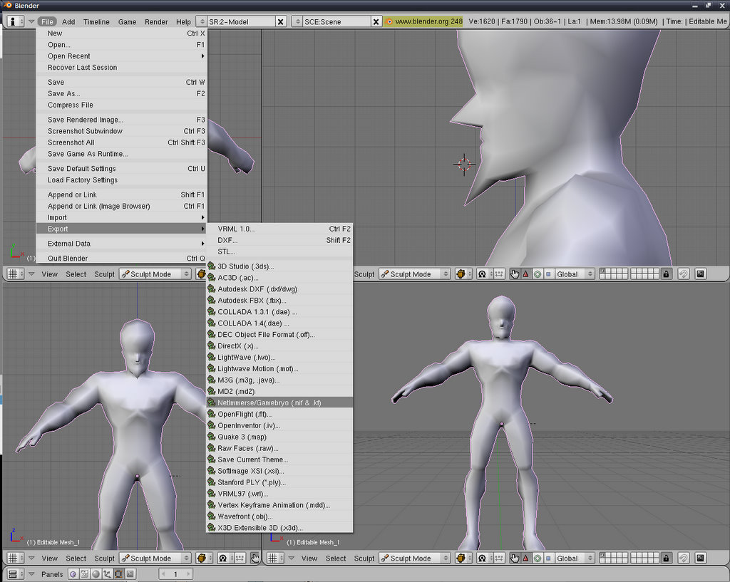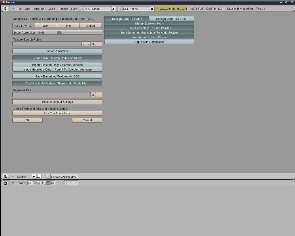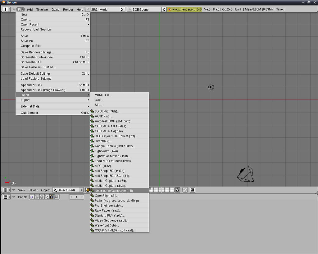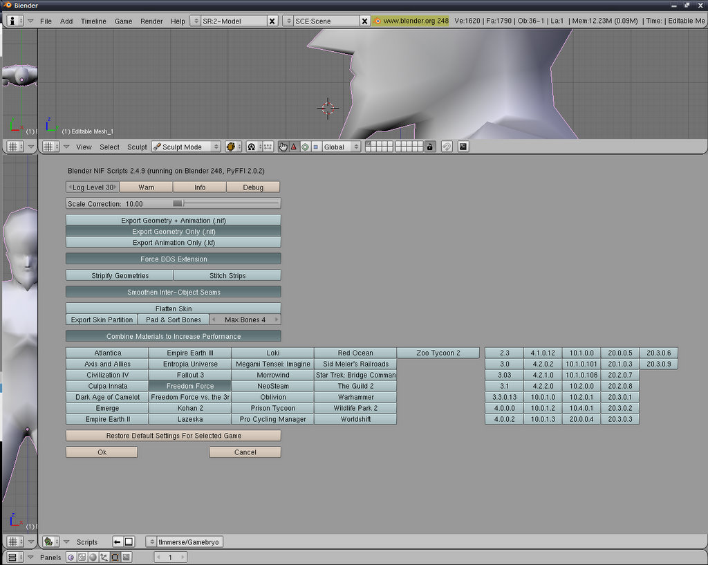 Traditionally 3d Studio Max was necessary to create meshes for Freedom Force, but as time has gone on the current versions of 3ds Max haven't supported Freedom Force well and NifTools has taken up the task of creating export scripts for various 3d modeling programs. We're going to be learning how to modify meshes in Blender for use in Freedom Force. Blender in this case will be used as a supplement to NifSkope. If you aren't familiar with NifSkope then you might want to take a loot at it first. GMax is another option for aspiring meshers. I tried using it for the same purpose but I ended up breaking the 'Skin Instance' and with it the animations.
