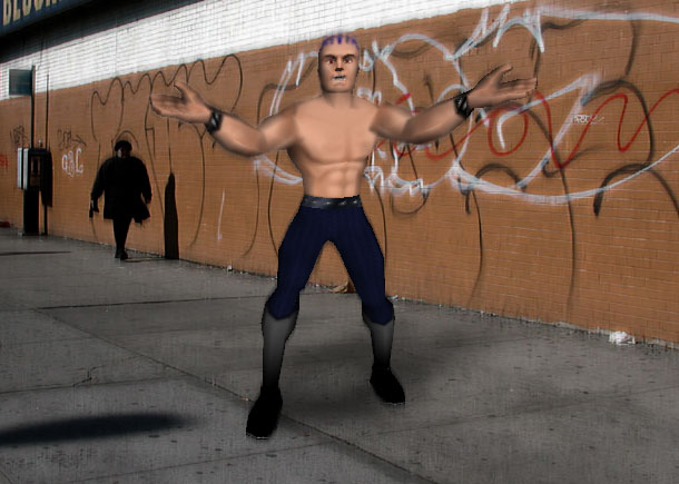 This dude is Hayden. He's named that for a mysterious spot in Hayden, Indiana where gravity doesn't work properly. Naturally his power was control of gravity. He had temper control problems so when he got angry he could lose control of his powers. I'm surprised that I was able to accurately depict this within the game but it worked out pretty well.